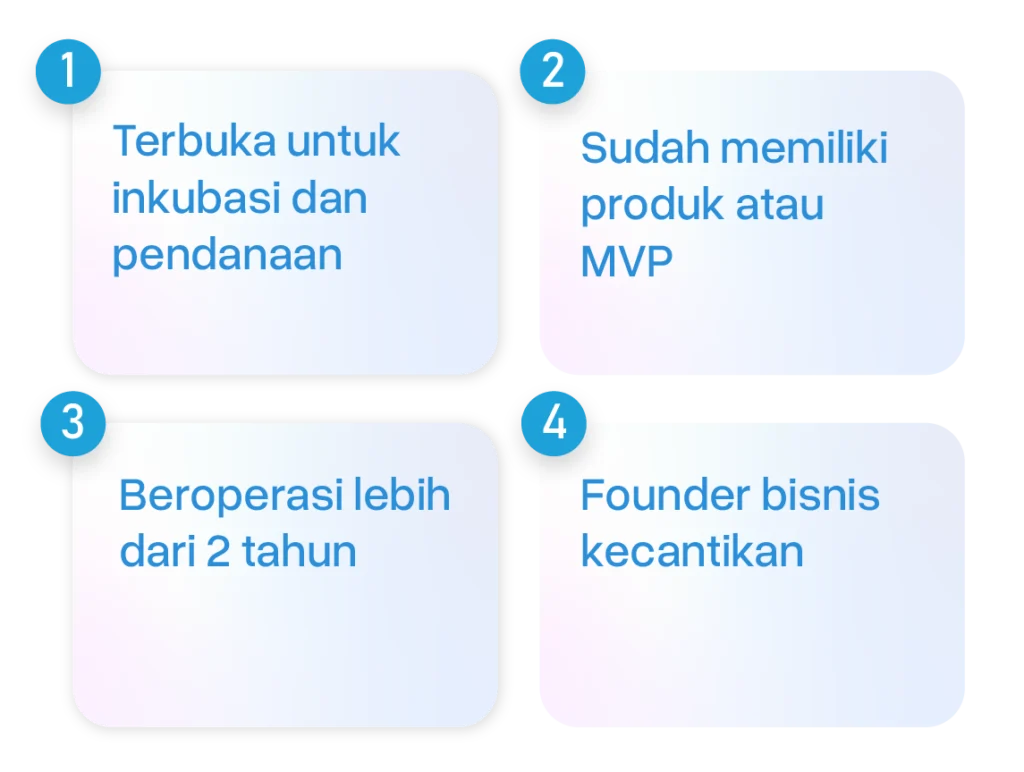 Founder bisnis kecantikan (skincare, bodycare, haircare, kosmetik dekoratif). Sudah memiliki produk atau minimal MVP (Minimum Viable Product). Bisnis sudah beroperasi lebih dari 2 tahun. Terbuka untuk inkubasi & pendanaan.
